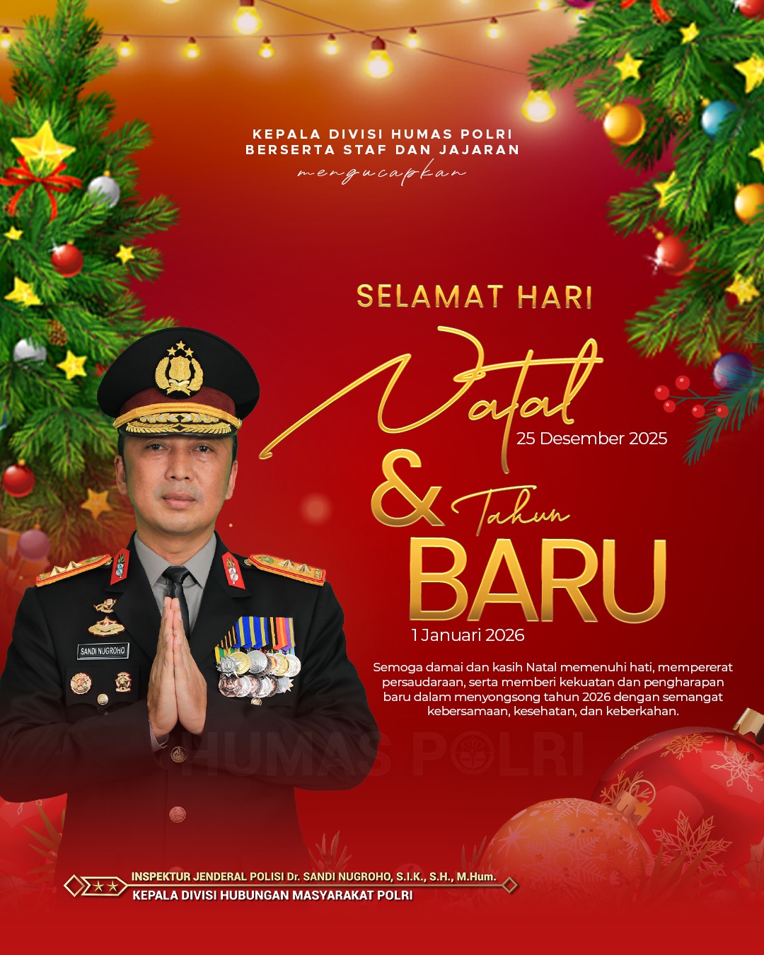 Kepala Divisi Humas Polri, Irjen Pol. Dr. Sandi Nugroho, S.I.K., S.H., M.Hum., mengucapkan Selamat Hari Natal 25 Desember 2025 dan Tahun Baru 1 Januari 2026. Semoga damai dan kasih Natal memenuhi hati, mempererat persaudaraan, serta memberi kekuatan dan pengharapan baru dalam menyongsong tahun 2026 dengan semangat kebersamaan, kesehatan, dan keberkahan.