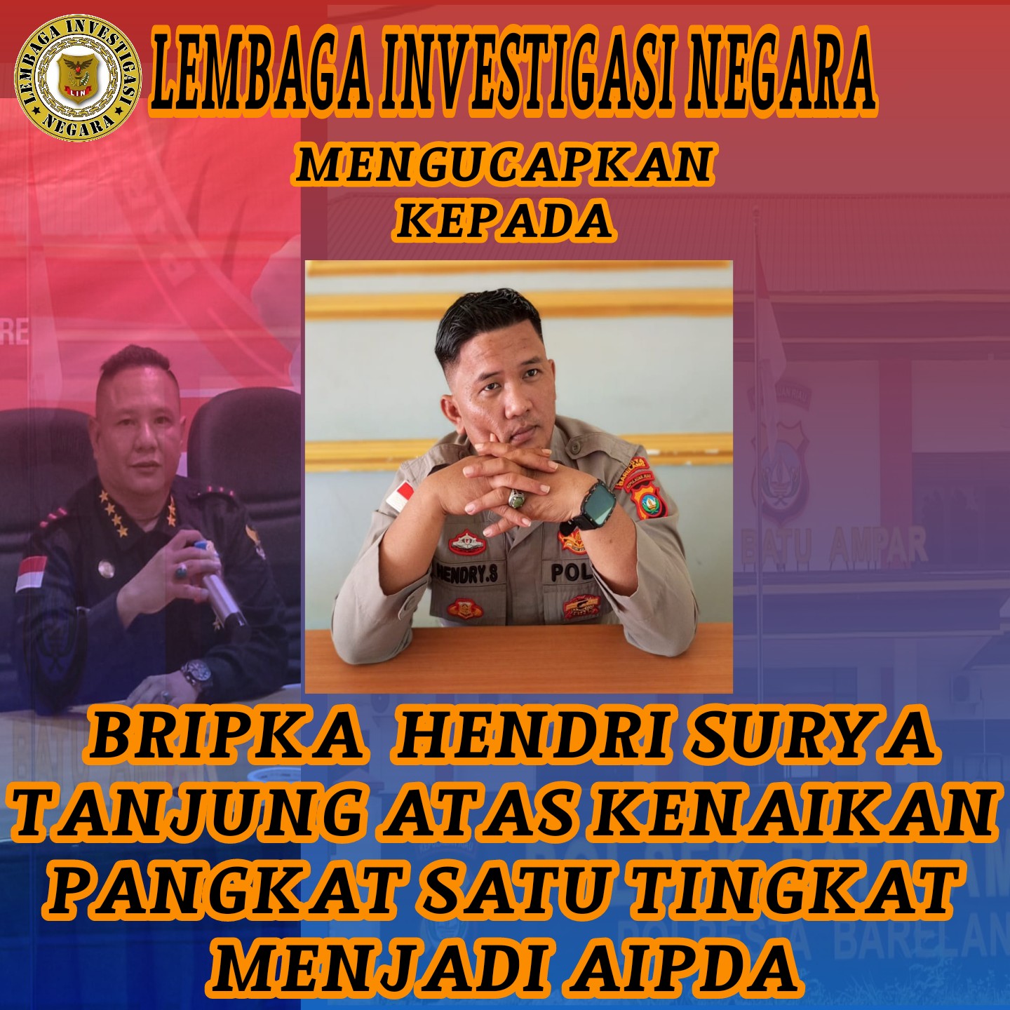 KETUA L.I.N LEMBAGA INVESTIGASI NEGARA,SELAMAT ATAS KENAIKAN PANGKAT KEPADA  BRIPKA HENDRI SURYA TANJUNG MENJADI AIPDA